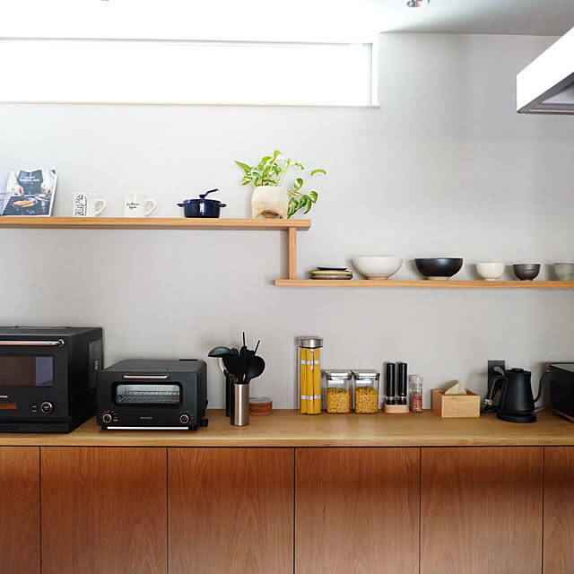 カップボードの上の家電をブラックに統一したり、食材をディスプレイのように配置したりと、インテリア性の高いMIKIさんのキッチン背面収納です。壁に取り付けている違い棚も印象的で、お気に入りの食器が映えますね。まるでモデルルームのようです!
