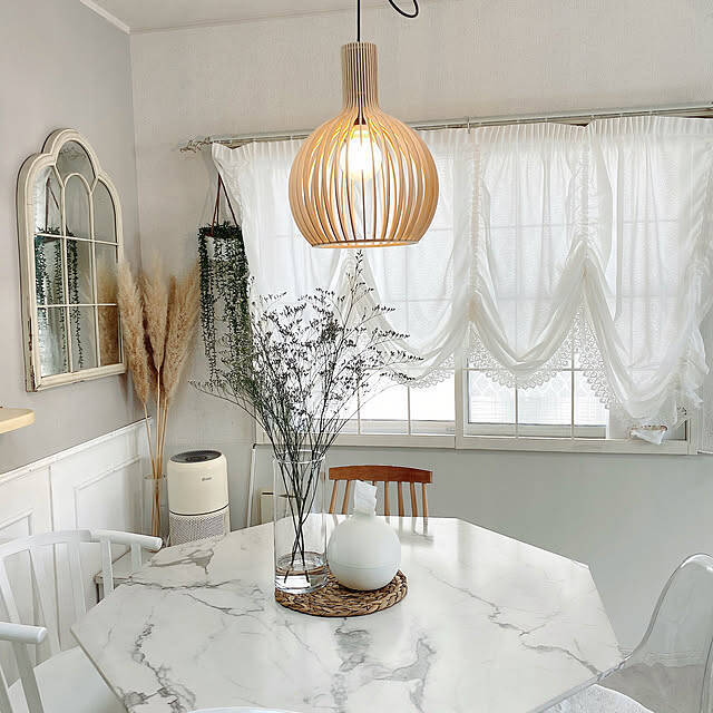 mii_home_39さんは、大理石調のリビングテーブルの上にニトリの花瓶を置いています。大きめのサイズで、ガラス製のシンプルなデザインです。透明な花瓶に生けられたお花が映えて、ホワイトインテリアを華やかに見せてくれていますね。