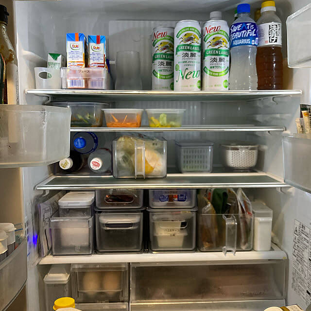 happy2011さんは、ニトリの「冷蔵庫ラック・トレー」を下段中央に置いています。高さの違うラックを2段に重ねて、トレーを引き出せるようになっています。奥に入っている物も取りやすくすることで、スペースをムダなく活用できていますね。