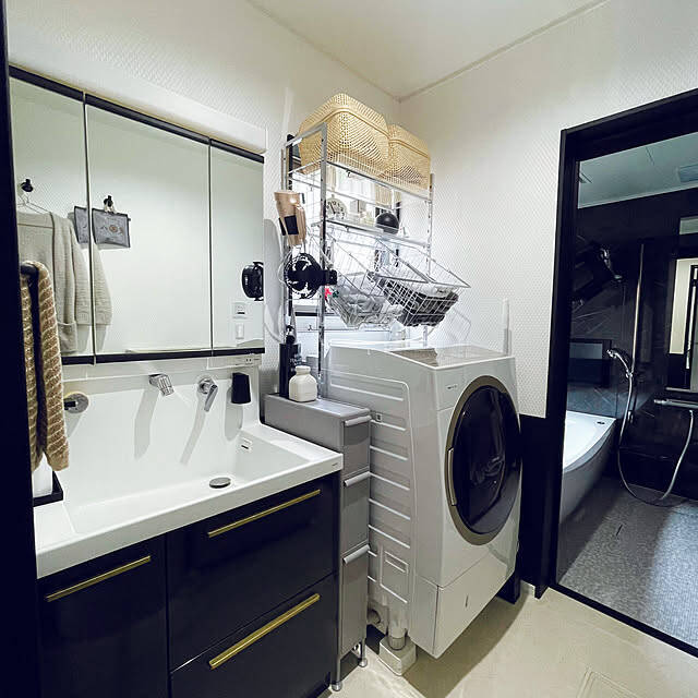 IKEAのランドリーバスケット「トルキス」を使われている、_rm_さん。スリムなランドリーバスケットが、洗濯機と洗面台の間にシンデレラフィットしたそうです。カバー付きなので、来客時には目隠し収納できるのもうれしいポイントです。