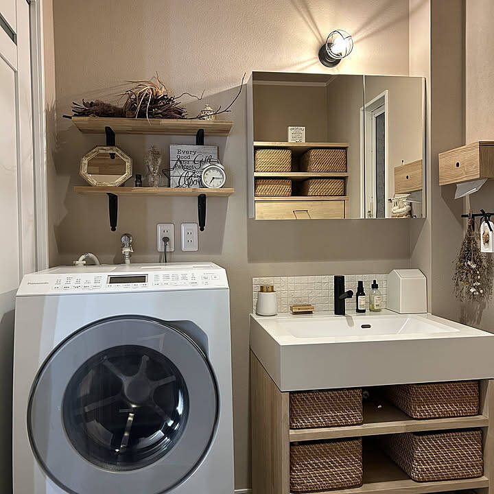 aromaさん宅は、ナチュラルに風合いを楽しむシンプルなスタイリングでコーディネートされています。それは、インテリアを整える難易度高めな洗面も然り。洗面やキッチンといった水まわりは、どう頑張っても生活感がちらついてしまうから『美しくまとめる』のは理想や憧れで終わってしまう……という方も多いと思います。そこでまずは、aromaさんが収納づくりで特に意識していることから教えていただきました。