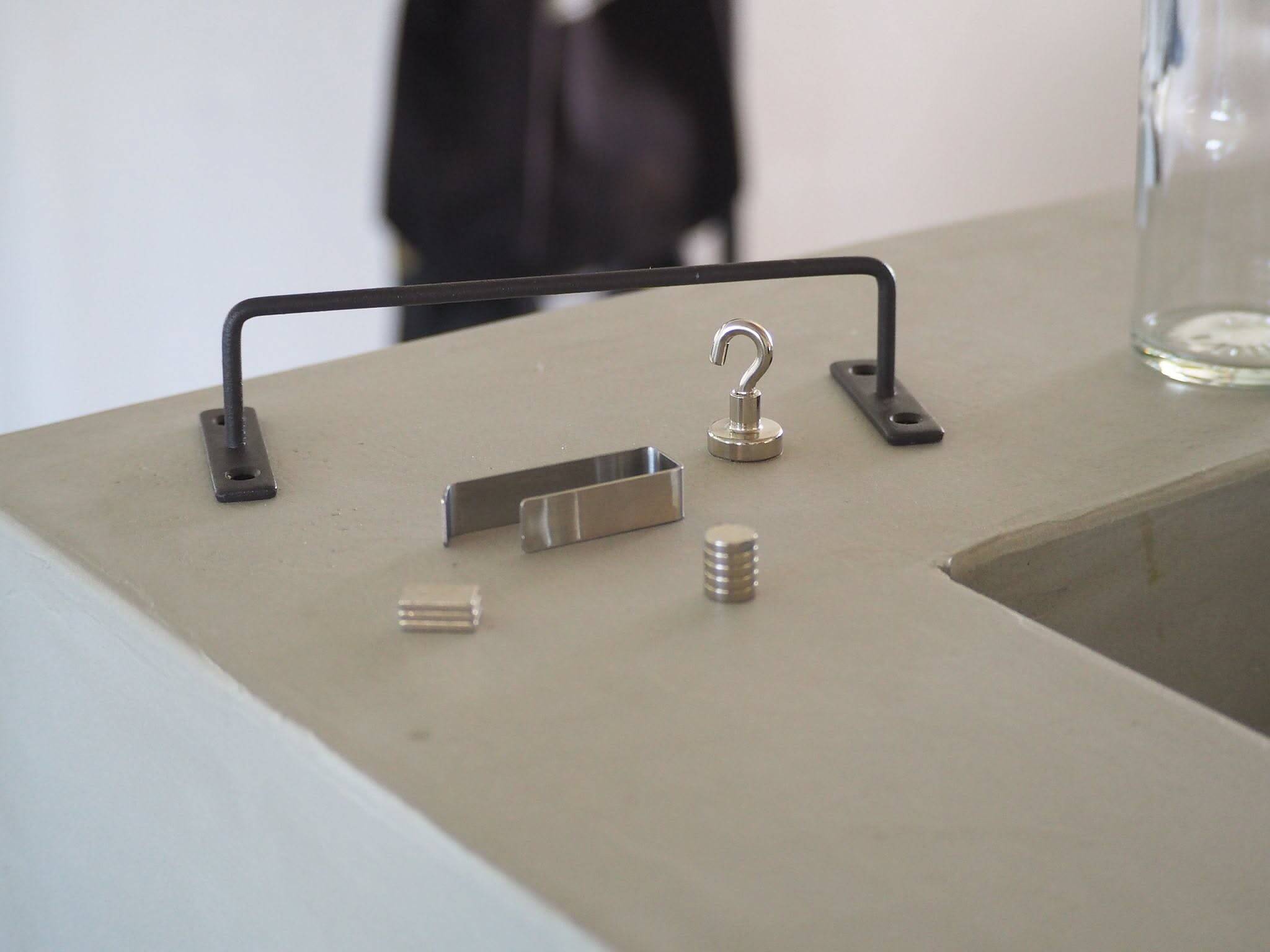 アイアンバーとヘアゴムホルダーに超強力マグネットを取り付けます。どちらも磁石が付くものですから、そのまま置くだけで大丈夫です。磁力がかなり強力なので、磁石の数を少し減らすと、レイアウトを変える際に移動させやすいと思います。
