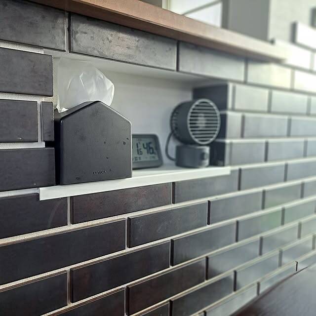 ダイニングのニッチをティッシュの定位置にした実例です。shimahigeさんが選んだKEYUCAのブラックのティッシュケースは、壁タイルの色味とよくなじみ、生活感が抑えられています。袋タイプを詰め替えられるうえ、場所も取りません。見た目も使い勝手もよく、お気に入りだそうです。