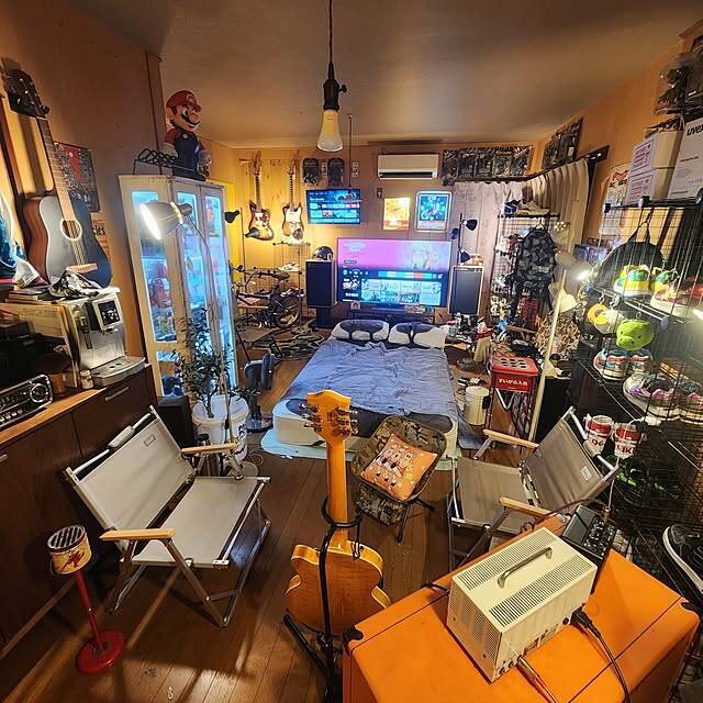 遊び心のある70年代風のインテリアを紹介してくださったfuchan0930さんの実例です。お部屋の真ん中にマットレスを置く配置をはじめ、壁面ディスプレイやライトにユーザーさんのセンスが感じられますね。まるで秘密基地のような空間です。