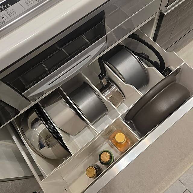 まずは、キッチンのコンロ下やシンク下のスペースに鍋を収納しているユーザーさんを見ていきましょう。引き出しだけでなく、観音扉の収納を上手に活用するアイデアもご紹介するので、チェックしてみてくださいね。