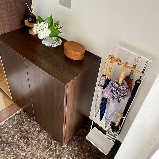 yasuyo66さんは「tower 引っ掛けアンブレラスタンド」を玄関に設置していました。傘同士が絡まりにくく、出し入れもスムーズに行えるそう。手前のバーには長傘、真ん中のバーには折り畳み傘、後ろのバーのフックには靴ベラやホウキまで、一台で幅広いアイテムを収納できます。