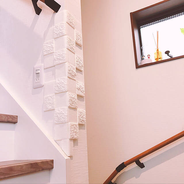 階段の角は手が触れやすく、気づくと黒ずんでしまうことも。chacoさんはセリアのサンドブロック柄リメイクシートを、バランスよくカットして汚れが気になる箇所に貼っています。発泡素材でやわらかく、壁と同系色なので一体感も◎。ワンポイントで雰囲気を変えつつ、壁をしっかり保護できるのが魅力です。