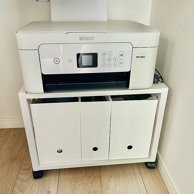 プリンターラックの下段に、ニトリのファイルボックスを並べたK-771さん。ワイド2つとレギュラー1つという組み合わせで、ラックの幅に気持ちよく収まっています。プリンター周りの色味をホワイトで統一することで、圧迫感がなく、清潔感あふれる空間になっていますね。