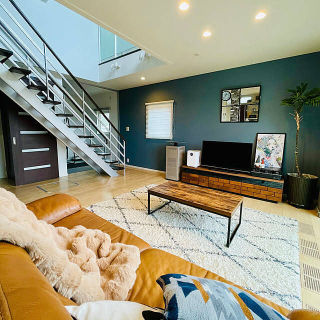 こちらの実例で採用しているのは、ニトリのセンターテーブル・ステインです。カフェ風の雰囲気あふれる天板とスタイリッシュな黒の脚で、ブルックリンスタイルのお部屋を作ってくれていますね。ブルーの壁面やブラウンのソファとも相性抜群です。