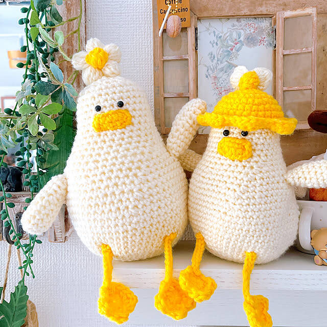 eriharuさんは、ダイソーのアクリル毛糸を使って編みぐるみをつくっていました。丈夫で耐久性が高い毛糸は扱いやすく、カラーも豊富に取りそろえられていますよ。かわいらしい表情のアヒルは、インテリアのワンポイントとしても活躍してくれそうですね。