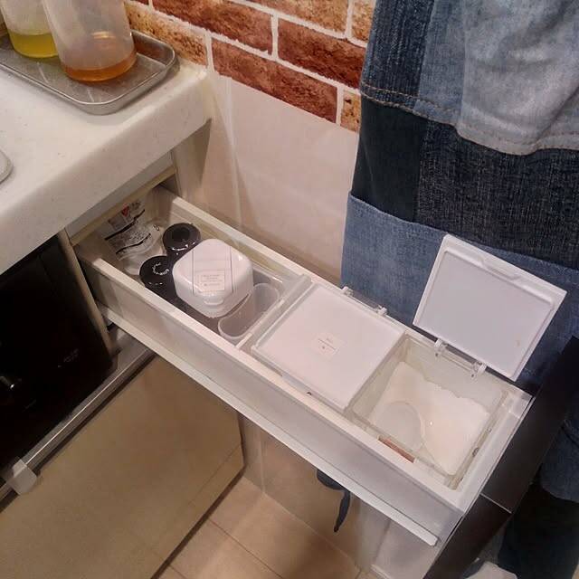 調理中に調味料をワンアクションで使えるよう、キッチンのコンロ横の引き出しに収納されているユーザーさん。スペースにぴったり収まっている四角いケースは、セリアの調味料入れです。蓋が大きく開くので、容器を引き出しから取り出すことなく中身をすくえ、詰め替えも楽にできそうですね。