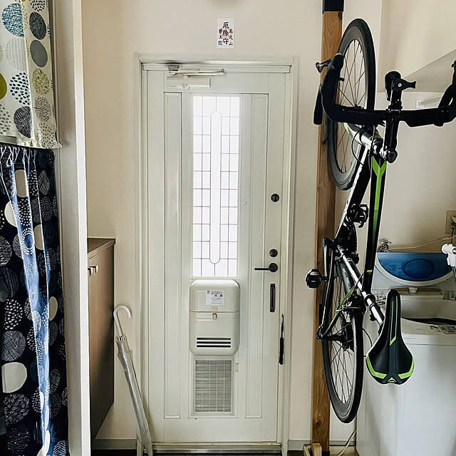 玄関の壁面にラブリコで自転車ラックをDIYし、掛けて収納できるようにしたbicycle_rin さん。家の中のさまざまな場所を試した末に、帰宅してすぐに掛けられるこの位置がいちばん使いやすかったそうです。 自転車を縦向きに配置することで空間が無駄なく使え、玄関まわりがすっきり整っています。