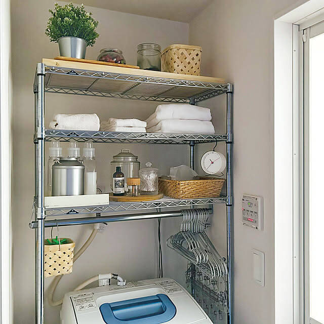 スチールラックを使って洗濯用品やタオルをまとめて収納しているのは、not_usingさんの実例です。棚板の高さやアイテムの配置にも気を配り、手に取りやすい動線になっていますね。洗濯機上の限られた空間をうまく使い、容器やバスケットを組み合わせて細かな道具がきれいに整理されています。