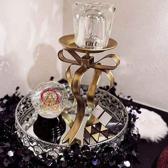 玄関をクリスマスに。 今年はリボン型の燭台と、クリスタルガラスのライトが加わりました。