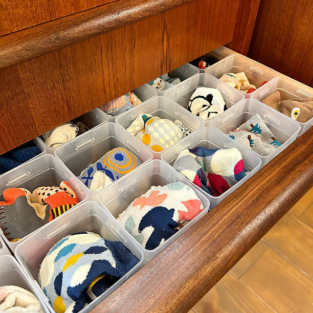 ダイソーの仕切り収納ボックスを使って、asami.さんはお子さんの靴下を収納しています。くるっと丸めた靴下がすっぽり収まるので、お子さん自身でも選びやすいのが魅力。仕切りは取り外し可能なため、厚手の靴下やタイツなども無理なく収納することができそうです。