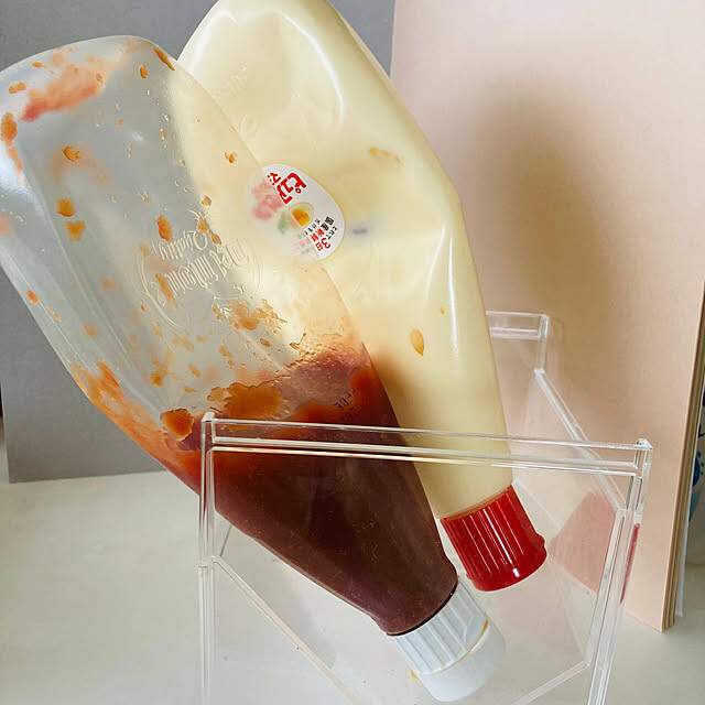 ケチャップやマヨネーズを、セリアのティータイムラックで収納されているのはharasaさんです。サイズ感もばっちりで、見た目もスッキリしていますね。ちょうどよい角度で収納できるので、出し入れもしやすそうです。