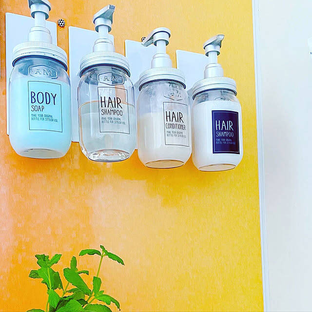 鏡の下にワイドタイプのバスルームラックを設置している実例です。ボトルを4本置いてもまだ余裕がある幅の広さで、使いやすそうです。下の部分は水切りできるようになっているので衛生面でも安心ですね。ボトルにはラベルを貼ってポップなバスルームに仕上げています。