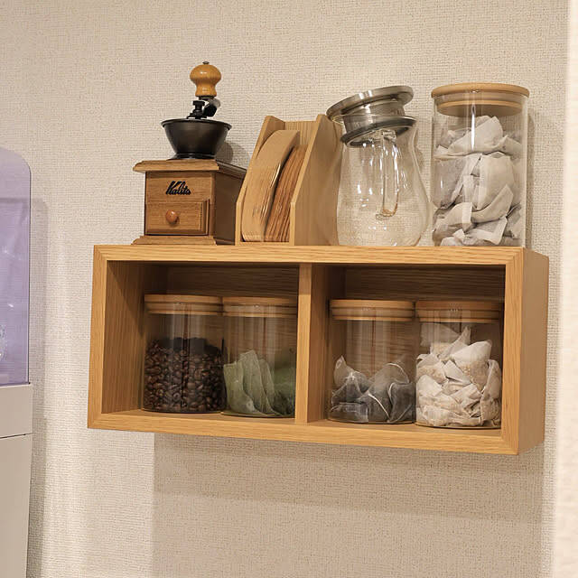 バンブー素材の蓋がやさしげな、ダイソーのガラスキャニスター。ユーザーさんは、コーヒー豆や茶葉類を収納されています。蓋はパッキン付きなので、湿気や酸化を防いでくれますよ。無印良品のシェルフとも相性◎。くつろぎ感たっぷりな、ナチュラルなお茶コーナーを作られています。