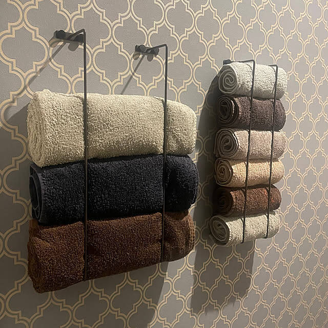 Y33355さんが紹介してくれたのは、こちらのタオル収納です。長さのあるアイアンバーを縦に取り付けることで、たくさんのタオルを一か所にまとめられるうえ、見た目もスッキリとした収納が叶います。バスタオルとフェイスタオル、それぞれしっかり収納できるようにアイアンバーの幅を変えている工夫もいいですよね。
