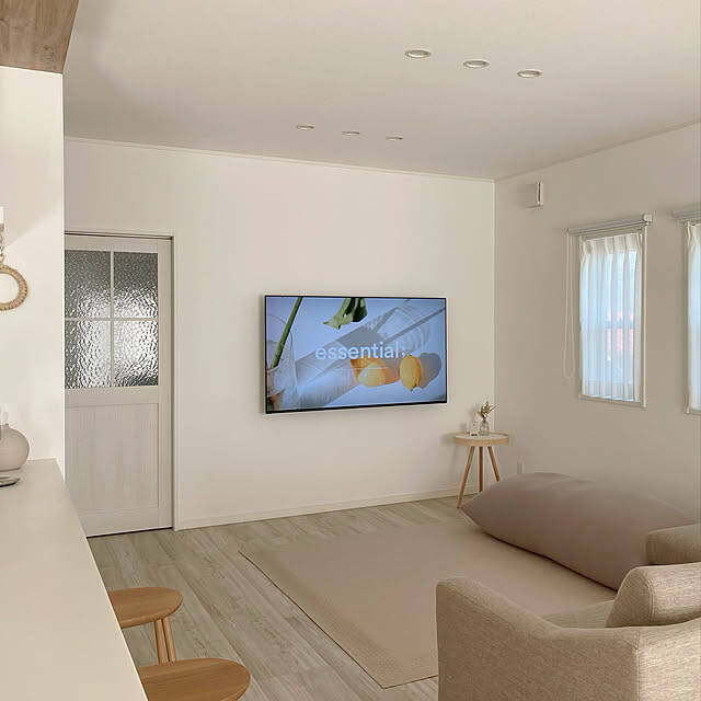 シンプルに整えられたリビングを紹介してくださったmさんの実例です。ベージュカラーの柔らかさが、スッキリとした空間に温かみをプラスしてくれていますね。優しい色味のラグもポイントです。