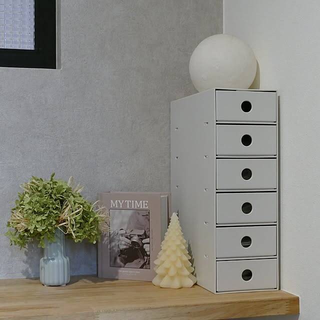 sacchiさんは小物収納ボックスの6段の引き出しを、一部を外して使っていました。引き出しを開けずにポイッと物を入れられて片付けが楽ちんです。段をまたいでスペースを確保できるので、1段では収まらなかった高さのある小物も収納できますよ。