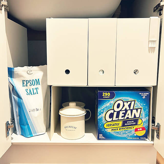 elinkさんは、洗面台下で、無印良品のスタッキングシェルフ・コの字棚を活用されています。上には、ファイルボックスを置いて、洗剤などを収納されているそうですよ♪スペースを有効に使ったアイデアですね。