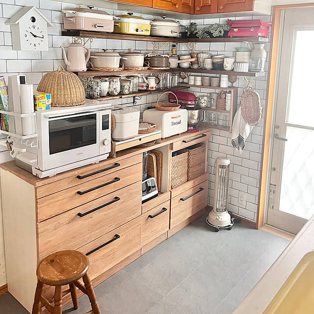 キッチンボードは家電のサイズによりどうしても余白ができてしまう。 棚受けの金具が電子レンジと接触したり、見た目のごちゃつきが嫌なので、棚受け金具なしの浮かせる収納棚をDIYしました。