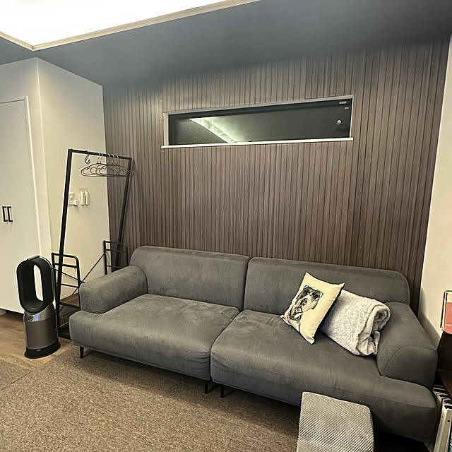 我が家は2階リビングのソファ横にお客さん用のハンガーラックを置いてます。荷物も一緒に置いておけるようにハンガーラック下に棚を置きました。普段は家族のちょい置き用になってます!