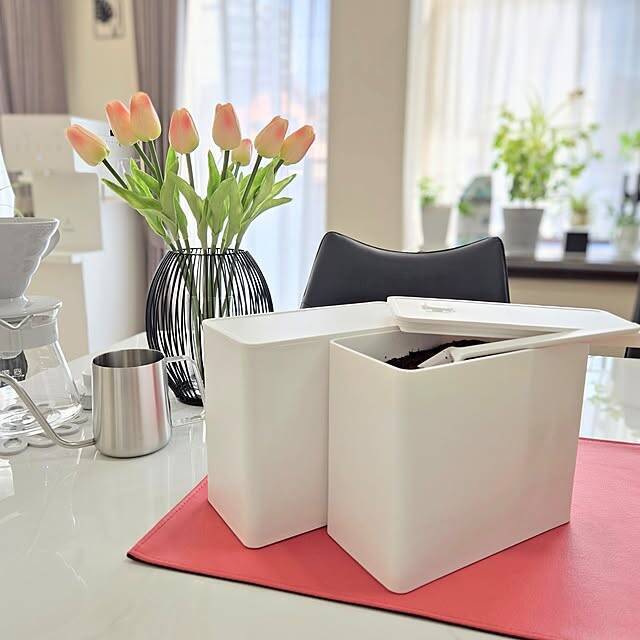 わが家のコーヒーセット。先日受賞でいただいたポイントで購入したタワーのバルブ付き密閉コーヒーキャニスター&フィルター収納ケース!コーヒー粉は500gの大袋で買うし、遮光、密閉できるものが欲しくて探しました!蓋にバルブがついていてワンプッシュで密閉、少なくなると底に掬い易い溝がある優れもの。スッキリ四角だからコーヒーやフィルター以外でも使い道ありそう◎ブラックはコーヒー粉が見にくいとのことで白にしましたが、粉がつくと目立つのでいつもフキフキしてます。