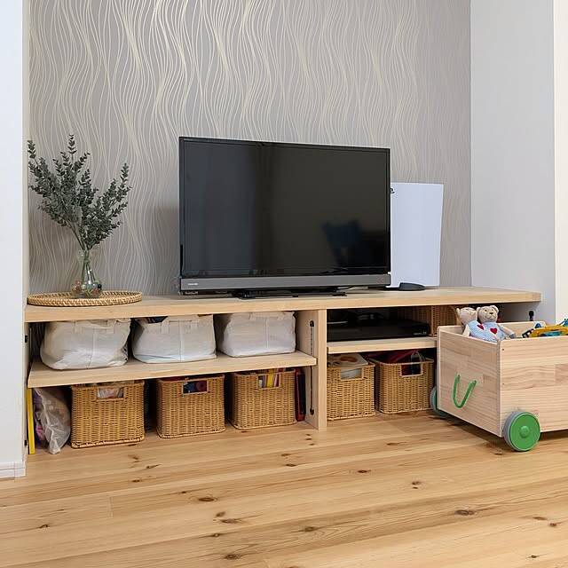 テレビ下のおもちゃ収納。3COINSのバスケットを使っています♡PPラタンの素材の丈夫さ、キャスターをつけなくても滑るように出し入れできるところがお気に入り!