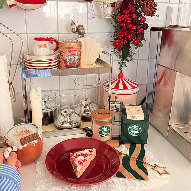 キッチンもクリスマスを楽しんでます!冷蔵庫の手前に掛けてあるのはIKEAのエプロンです。キッチンに立つ時間が長いので気分とモチベーションをあげてます!冷蔵庫につけたジンジャーブレッドマンのマグネットがお気に入りです♡