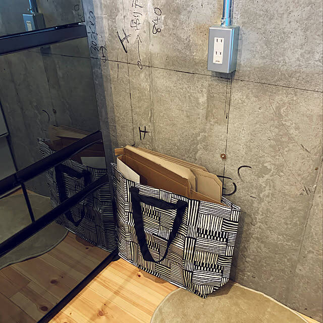 hidemaroomさんは、IKEAのショッピングバッグをダンボールストッカーとして活用しています。容量が大きく持ち手が付いているので、ダンボールを持ち運ぶ際にも便利です。モノクロのスタイリッシュな柄が生活感を上手に隠してくれていて、ダンボールを処分するときも気分が上がるんだそうですよ。