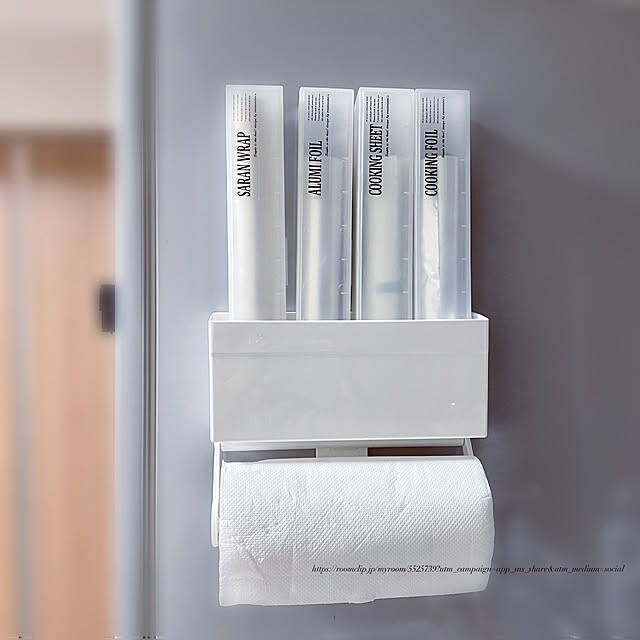 キッチンペーパーとラップを収納できるホルダーを購入されたlocaさんの実例です。シンプルなデザインのホルダーは、インテリアをスッキリ見せてくれて良いですね。ロゴの入ったラップケースもポイントです。