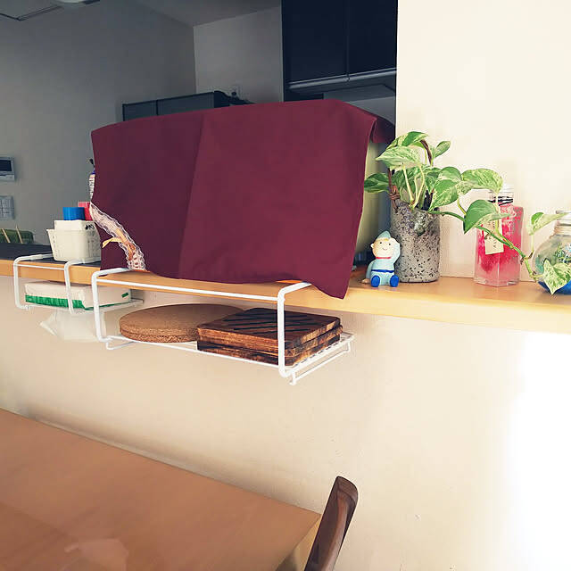 akiwaka-roomさんは、ディッシュラックを逆さまにしてカウンターに引っ掛け、吊り下げラックのように活用されていました。大きい方には鍋敷き、小さい方にはティッシュを収納。棚が格子状のタイプなので、ティッシュは取り出し口を下に向けると、下からスムーズに引き出せます。