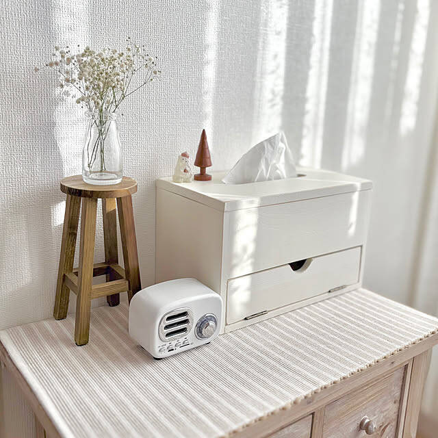 salut!の木製ティッシュケースを使用されている、miminkoさん。ふたはマグネット式でしっかり固定されていて、出し入れも簡単だそうですよ。下部には小物入れが付いていて、ちょっとしたモノが収納できます。シンプルなデザインもGoodです!