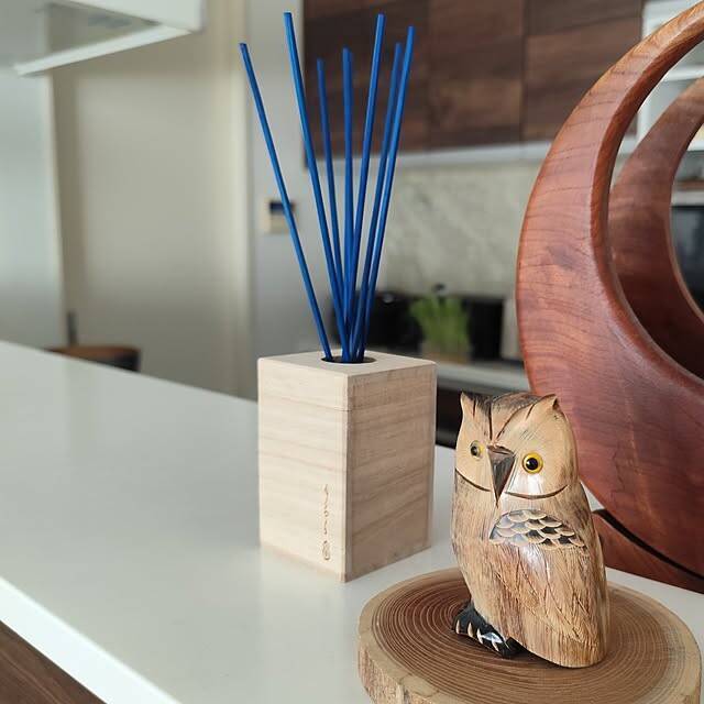 木箱のカバー付きのディフューザーをキッチンカウンターに置かれている、coco0.84.さん。木目が美しい木箱に、あざやかなブルーのスティックが映えていますね。木彫りのフクロウと並べて、和モダンな空間を演出してくれます。