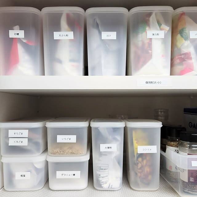 小麦粉や片栗粉、砂糖などの粉ものは、無印良品の「粉もの保存容器」がおすすめです。love1017さんは袋ごと入れていて、軽くて開け閉めもしやすいと紹介してくださっています。ラベルを貼れば、中身も一目で分かって使い勝手抜群。容器をそろえて並べると、見た目もきれいに整いますね。