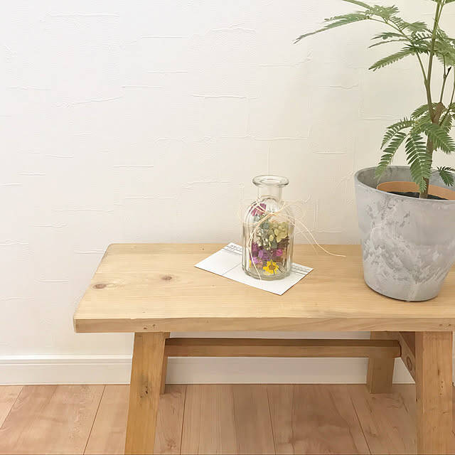 yu-rinさんは、ダイソーのガラス瓶に色とりどりのドライフラワーを入れて楽しまれています。透明な瓶だと、どこから見てもドライフラワーの色味や表情を愛でられるのが良いですね。瓶に麻紐やリボンでさりげない飾りつけをすると、さらに可愛らしさが増します。