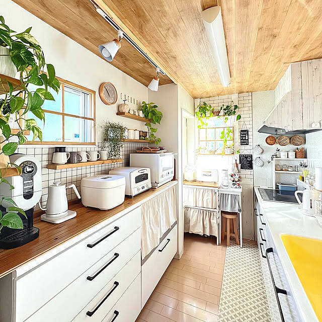 2LDKの二世帯住宅で、ご夫婦と3匹の愛犬と暮らすyumimaruさん。DIYとグリーンを取り入れながら、自分らしい空間づくりを楽しまれている様子が印象的です。手を動かしながら少しずつ整えてきたキッチンには、ボタニカルな心地よさと、作ることを楽しむ気持ちが随所に感じられます。ナチュラルなトーンでまとめられたキッチン空間は、温かみがありながらもすっきりとしていますね。