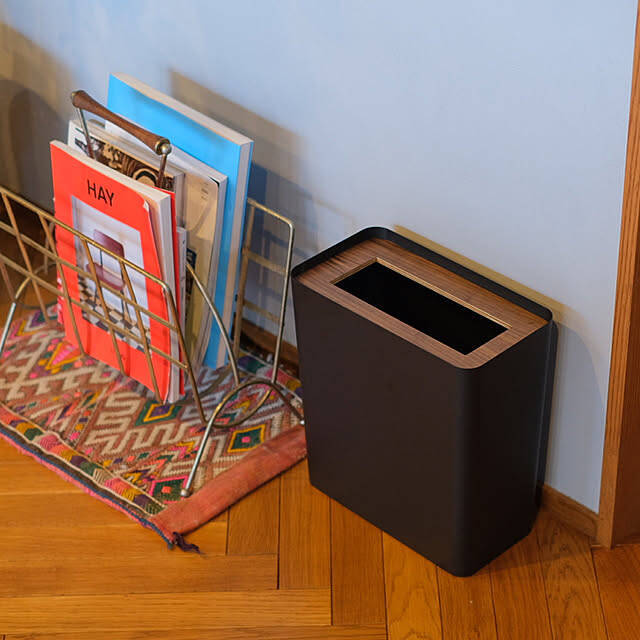 HandTさんが使用されているのは、山崎実業RINシリーズの「トラッシュカン」です。スチール製でマットなモノトーンカラーの本体も、木目調の蓋もインテリア性抜群で、生活空間に置きやすいのが特徴。蓋を被せることで、セットしたビニール袋の目隠しまでしてくれます。