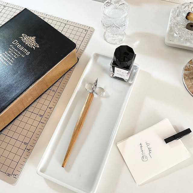 文房具や小物を一時的に置いておきたいときに便利なのが、無印良品の「白磁トレー」です。daifuku3yadeさんは、ペントレーとして活用されています。ホワイトカラーのシンプルなデザインなので、お気に入りの文房具も映えますね♪