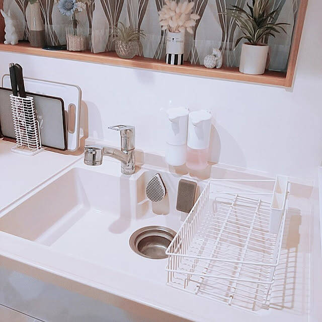 kirakirahikaruさんは、キッチンのスポンジラックと排水口のフタを置かないようにしています。洗わないといけない物は減らしたいと考え、撤去したとのこと。洗剤とハンドソープを浮かせて収納して、掃除が楽になるようにも工夫されています。
