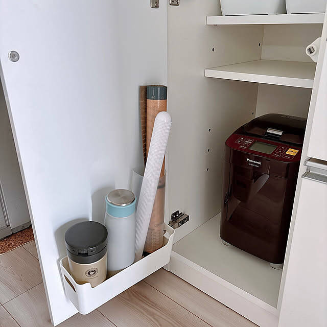 こちらのユーザーさんは、キッチンキャビネットの扉裏に収納スペースを作ったそうです。マジックテープのように着脱ができるコマンドファスナーを使うことでケースを固定しており、複数のキッチンツールがしっかり収まっていますね。白い色合いも周りと馴染んでいて、すっきりと仕上がっています。