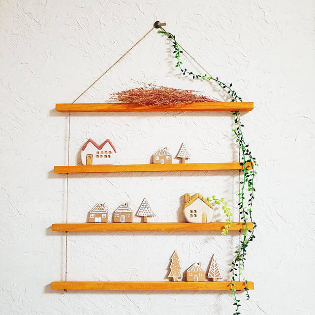 twinsさんは、セリアの木材とご自宅にあったという麻紐でディスプレイスペースを手作りされていました。ラダーのような雰囲気が、良いですね。セリアの「もくかるねんど」で作られたというミニチュア雑貨も、キュートです。