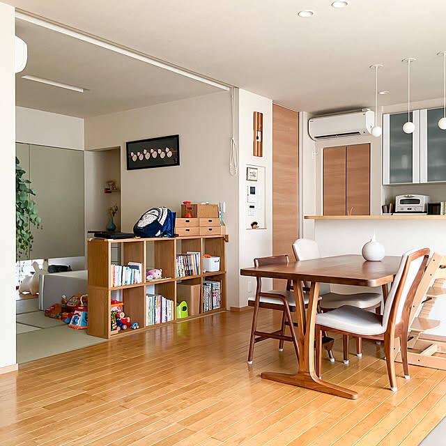 リビングの隣に小上がりの和室があるお家です。仕切りの壁や襖はなく、リビングの一部のようにレイアウトされていますね。洋風のスタッキングシェルフやテーブルを置き、隣の洋室と一体感のある小上がりに仕上げています。