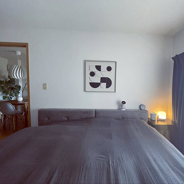 グレーカラーを中心に、モノトーンでコーディネートされたakoさん宅のベッド周り。ヘッドボードの上の壁には、アートが飾られています。お部屋のワンポイントになって奥行きがうまれ、すっきり見えますね。無地の寝具との対比もGoodです!