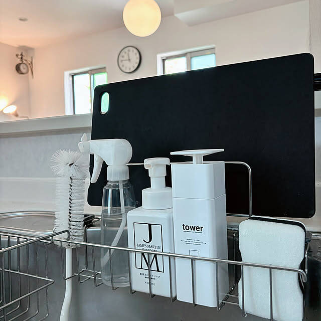 山崎実業のtowerシリーズから「片手で出せるディスペンサー」を購入された、mmさん。シンプルで高級感のある見た目と、軽い押し心地が魅力です。食器洗い用の洗剤を詰め替えれば、スポンジで押すだけで簡単に洗剤が出せます。