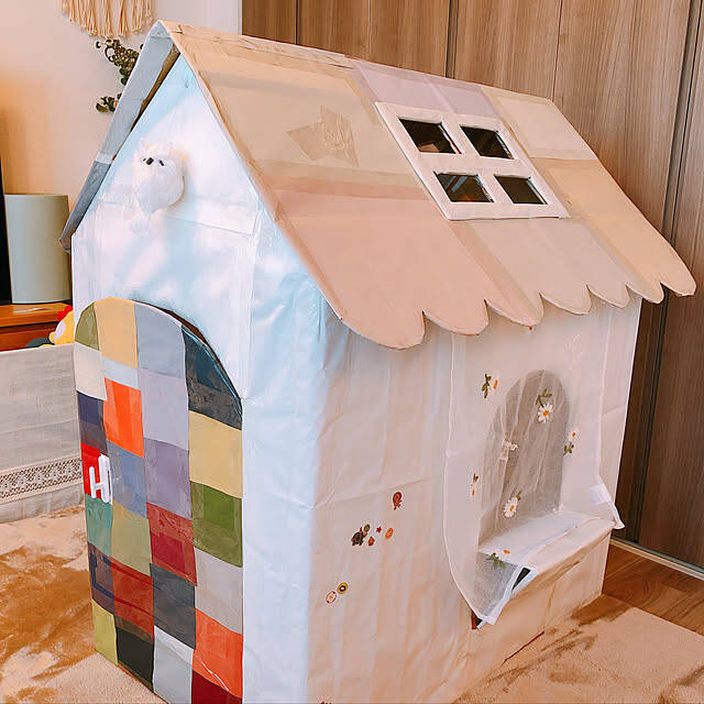 お家にあるものでダンボールハウスをDIYされた、pechi.homeさん。壁には紙を貼って、段ボールを隠しているそうです。屋根が取り外せることで、折りたたんで収納も可能とのこと。遊ぶときだけ取り出せて、場所を取らないのがうれしいですね。