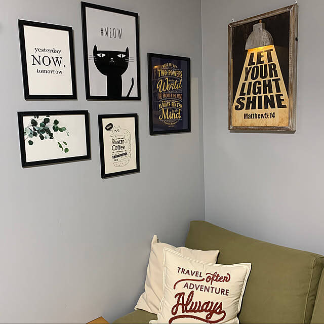 keiさん宅に飾られているのは、ライトをモチーフにしたウォールLEDライトです。LEDライトが入っているので、実際にライトを付けることができるうえ、昼と夜とでそれぞれ違った表情を楽しめるのが特徴。モノトーンでまとめられたポスターとの組み合わせ方や、配置のバランスなどセンスを感じますね。