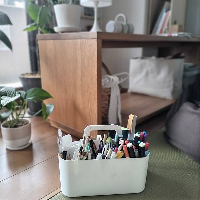 sakiさんは、お子さんたちの文具類を、ニトリの収納ケースにまとめています。手軽に持ち運ぶことができるので、いろいろな場所で使えますね。ワンアクションで出し入れできるのも、お子さんにとって使いやすそうです!